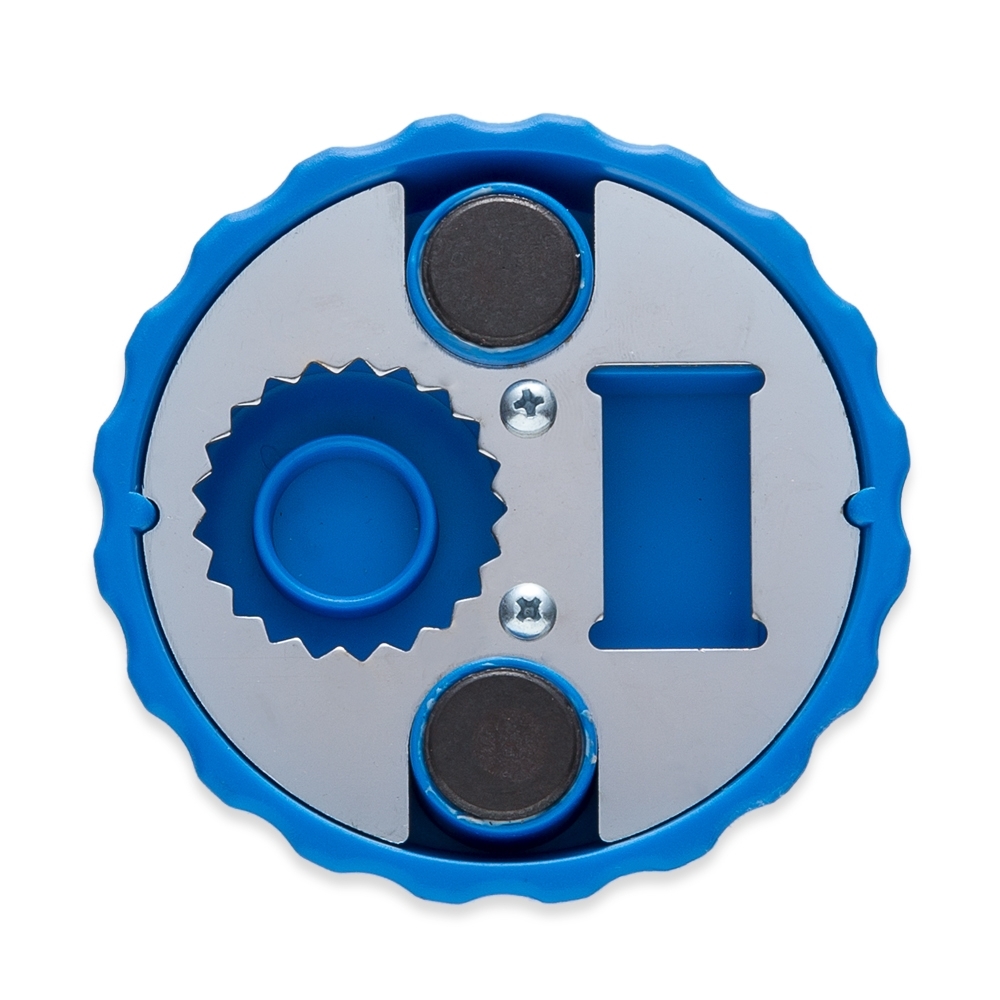 Abridor formato tampa de garrafa com imã para geladeira, possui área demarcada na parte superior. Contém dois tipos de abridores de garrafa.