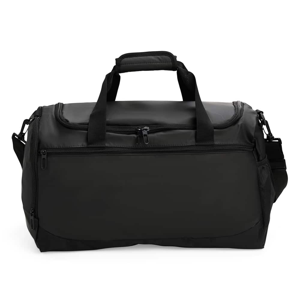 Bolsa em couro sintético impermeável, com detalhes em malha e capacidade de até 26 litros. Apresenta três compartimentos em diferentes tamanhos, incluindo espaço tênis, além de bolso lateral em tela de nylon com elástico. Possui duas alças de mão com suporte de velcro e alça transversal.