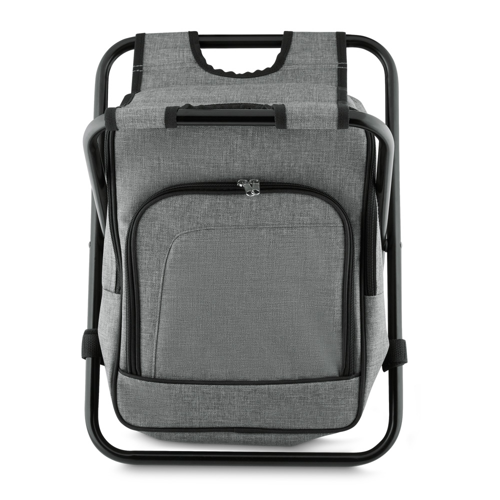 Bolsa térmica e cadeira, capacidade 10 litros, tecido poliester, com bolso frontal, cor cinza, alça de costas regulável, parte interna soldada, retém liquido.