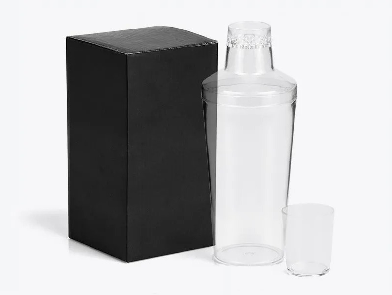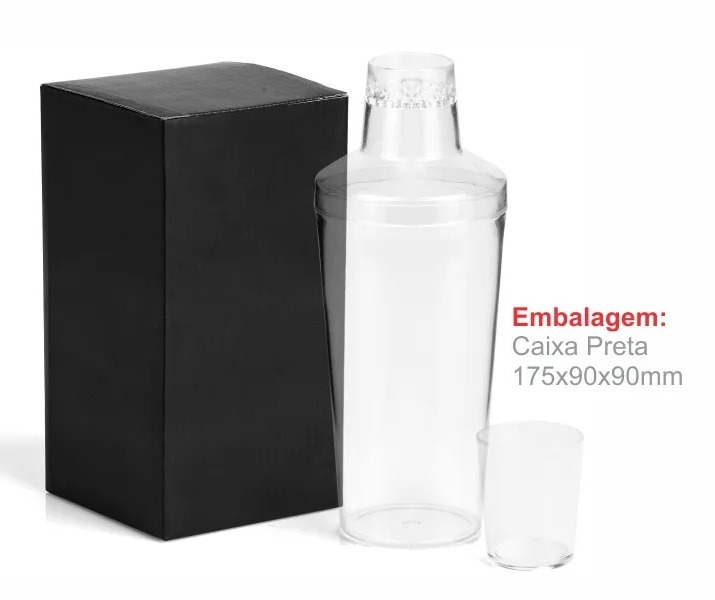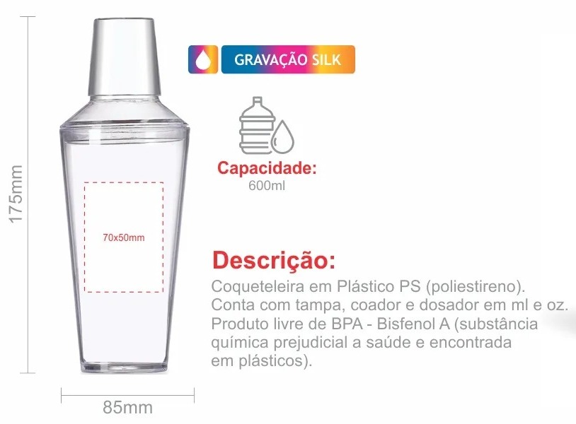 Coqueteleira em Plástico PS (poliestireno). Conta com tampa, coador e dosador em ml e oz. Produto livre de BPA – Bisfenol A (substância química prejudicial a saúde e encontrada em plásticos).