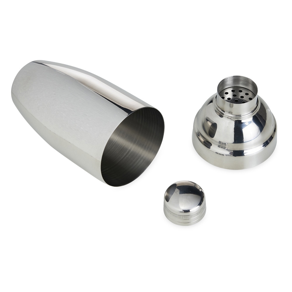 Coqueteleira de inox com capacidade para 750ml, contém tampa de pressão com peneira e tampa protetora.