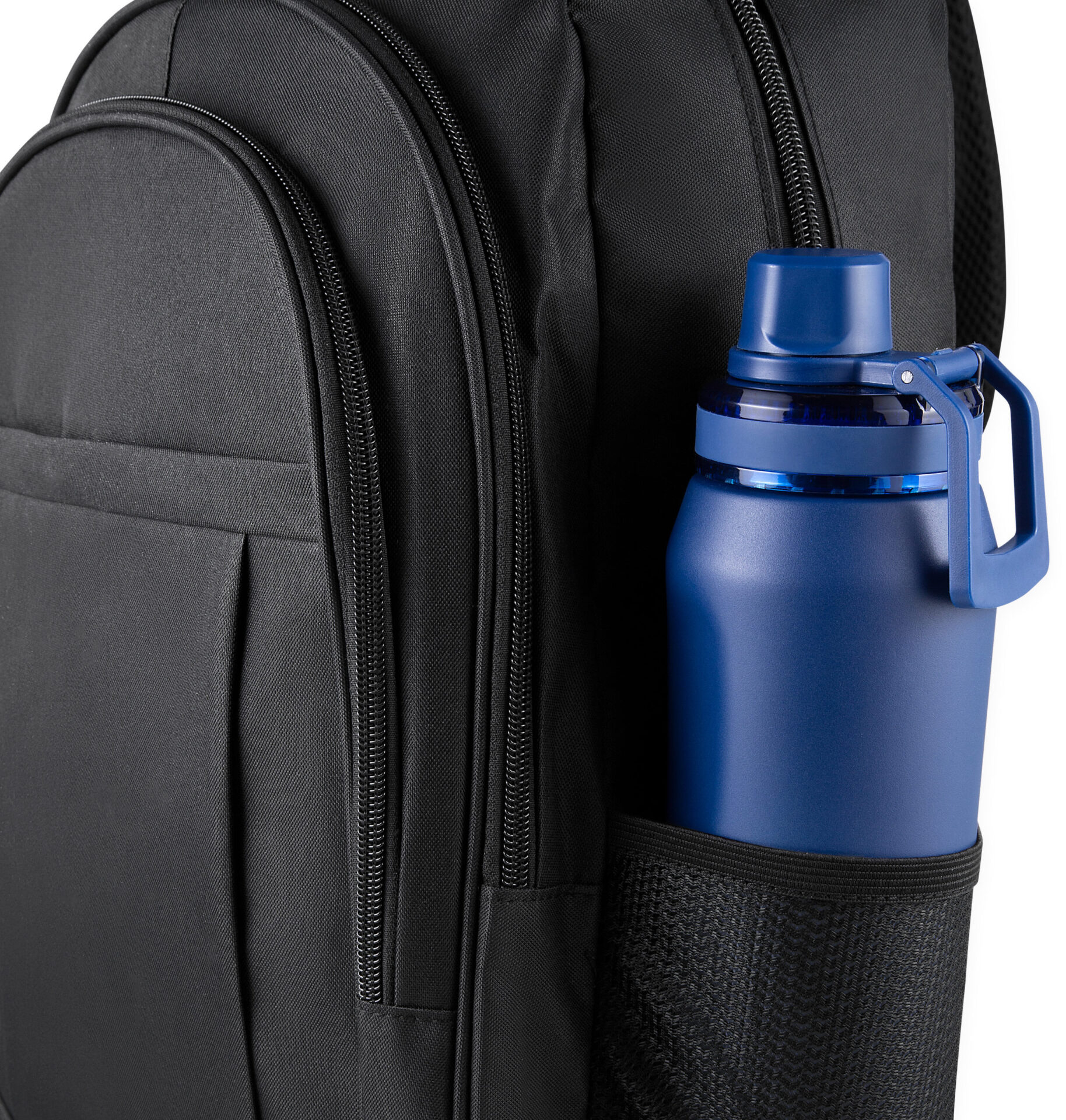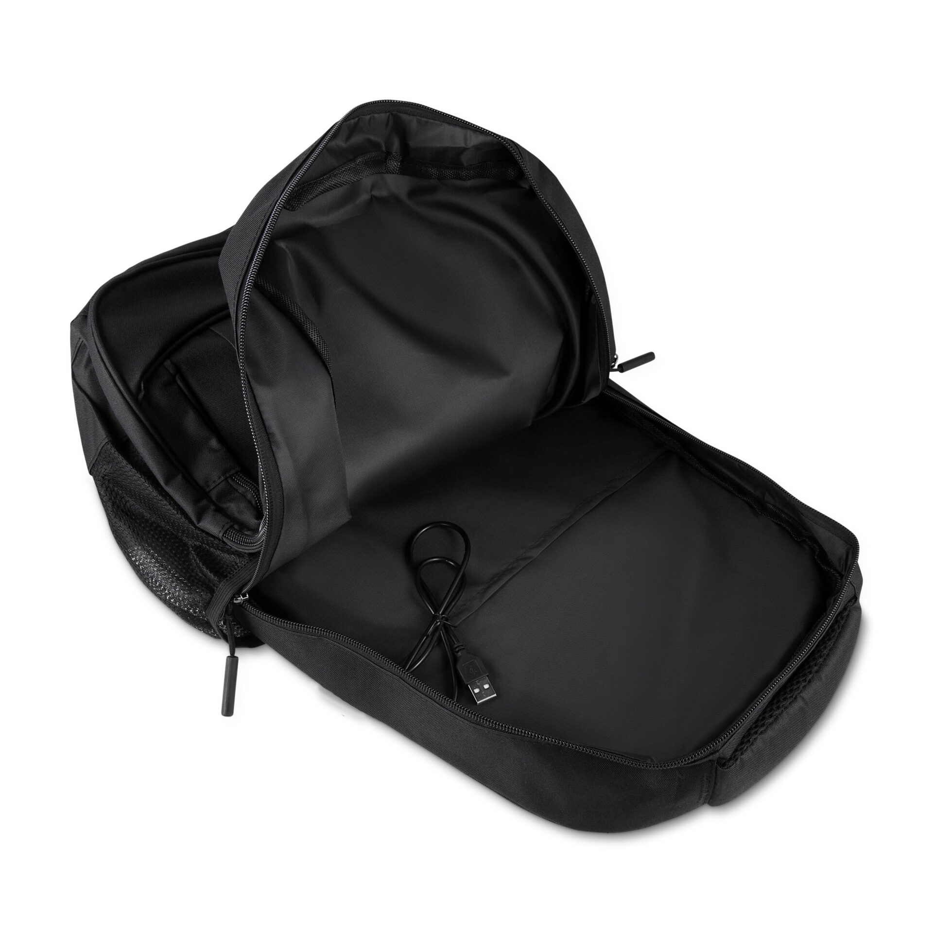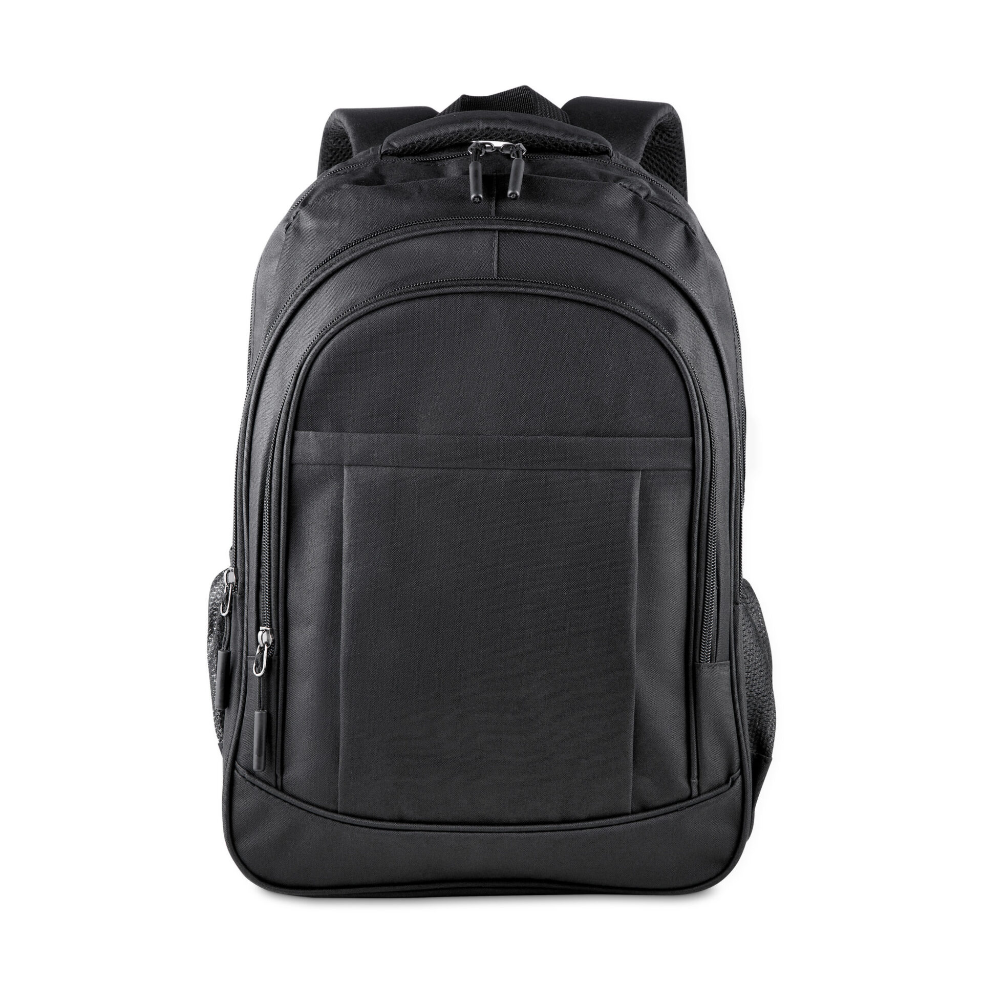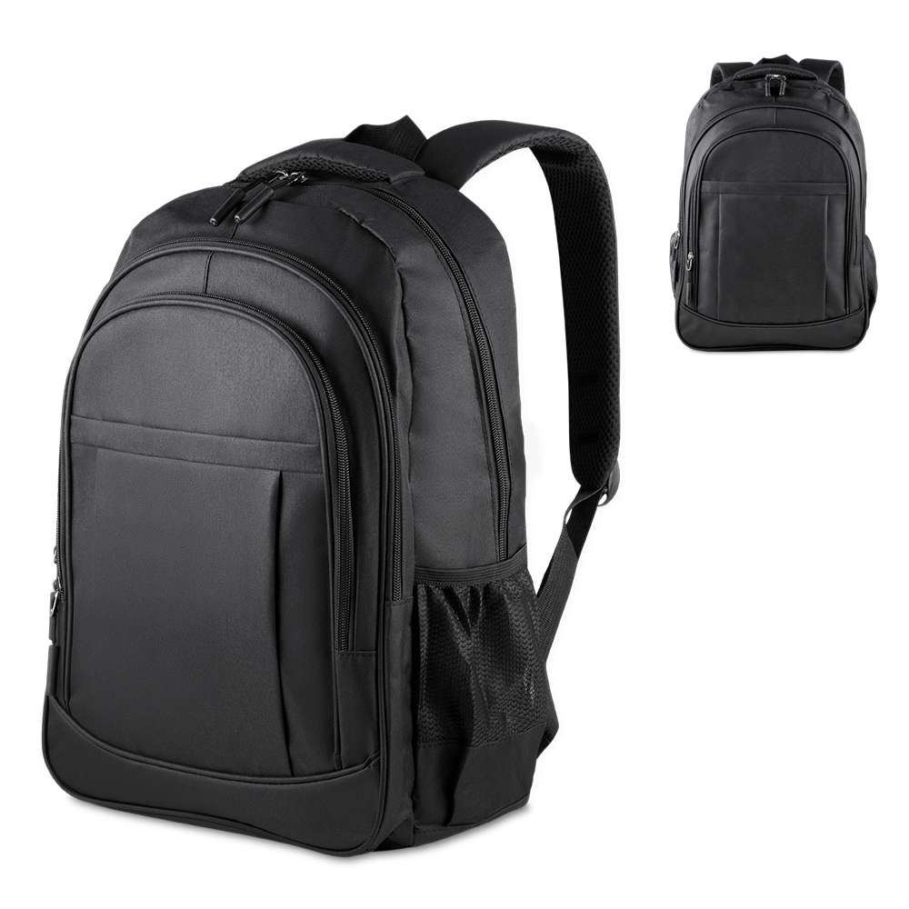 Mochila confeccionada em tecido externo de poliéster 300D e tecido interno de poliéster 190D, com capacidade total de 23 litros. Possui três bolsos frontais com zíper, compartimento principal com fechamento em zíper, dois bolsos laterais e engate para mala de viagem. Conta ainda com compartimento interno próprio para notebooks de até 15,6 polegadas.